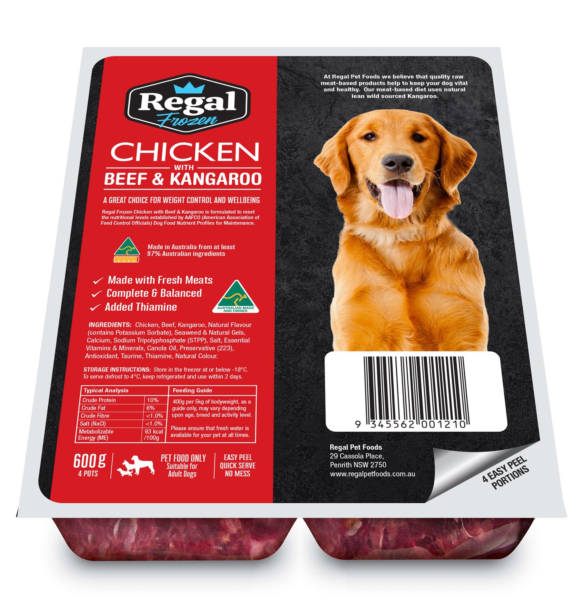 Description: Regal Chicken, Beef & Kangaroo - Frozen 4x150g for dogs contains fresh, raw kangaroo meat, Prime Beef & Chicken. Suitable for dogs eating a raw food diet, this product is very high in protein and low in fat and cholesterol. Dogs love the full flavour and aroma. The 600g pack now comes in a convenient 4x150g. Keep the rest freshly sealed for later use.